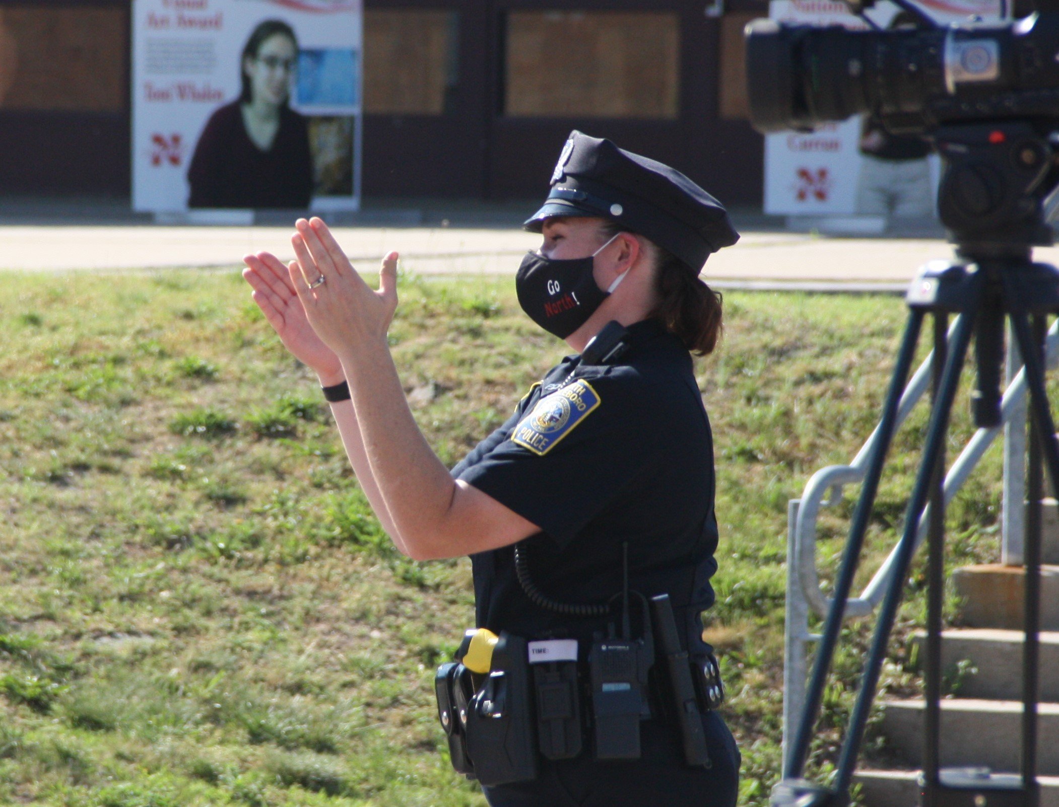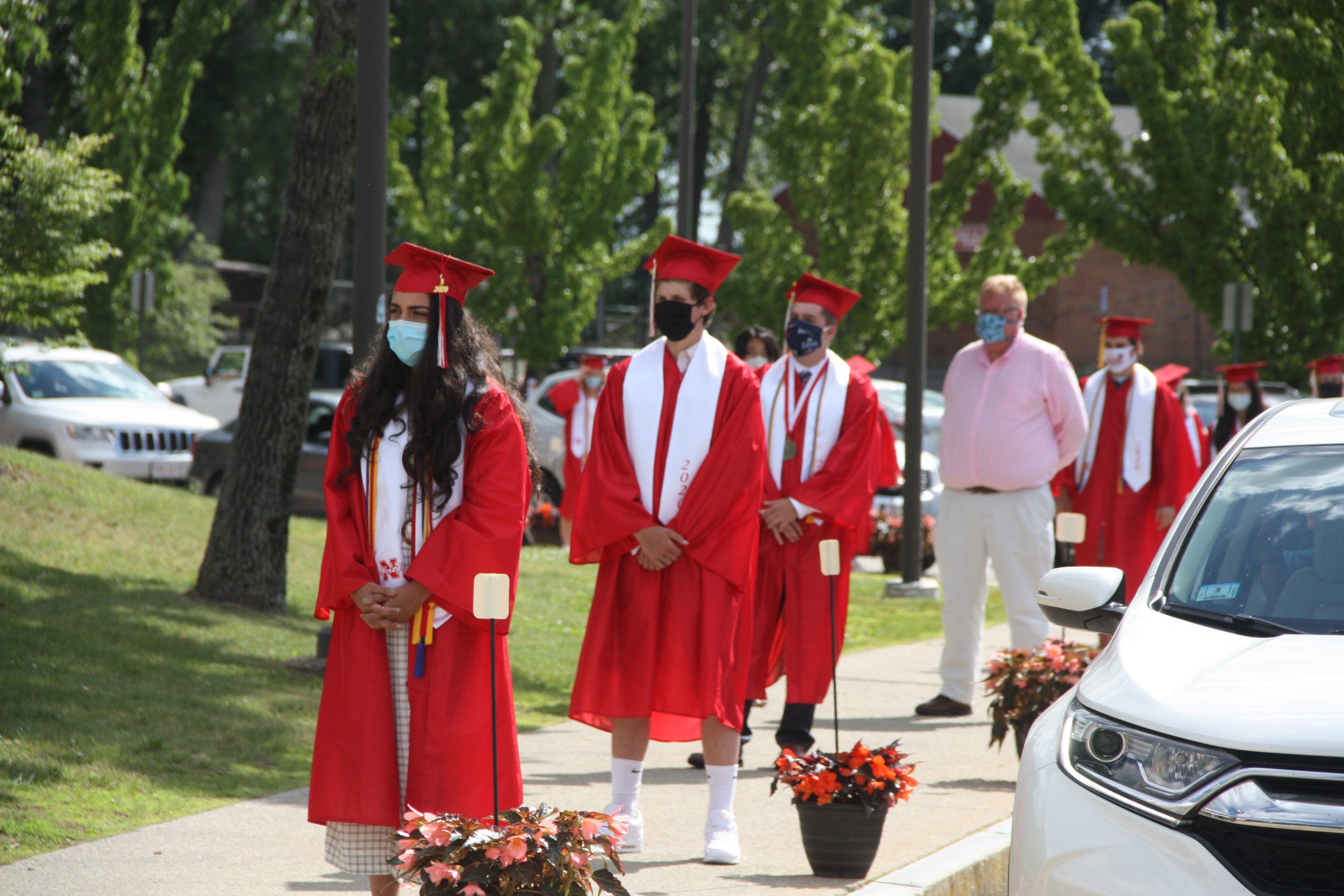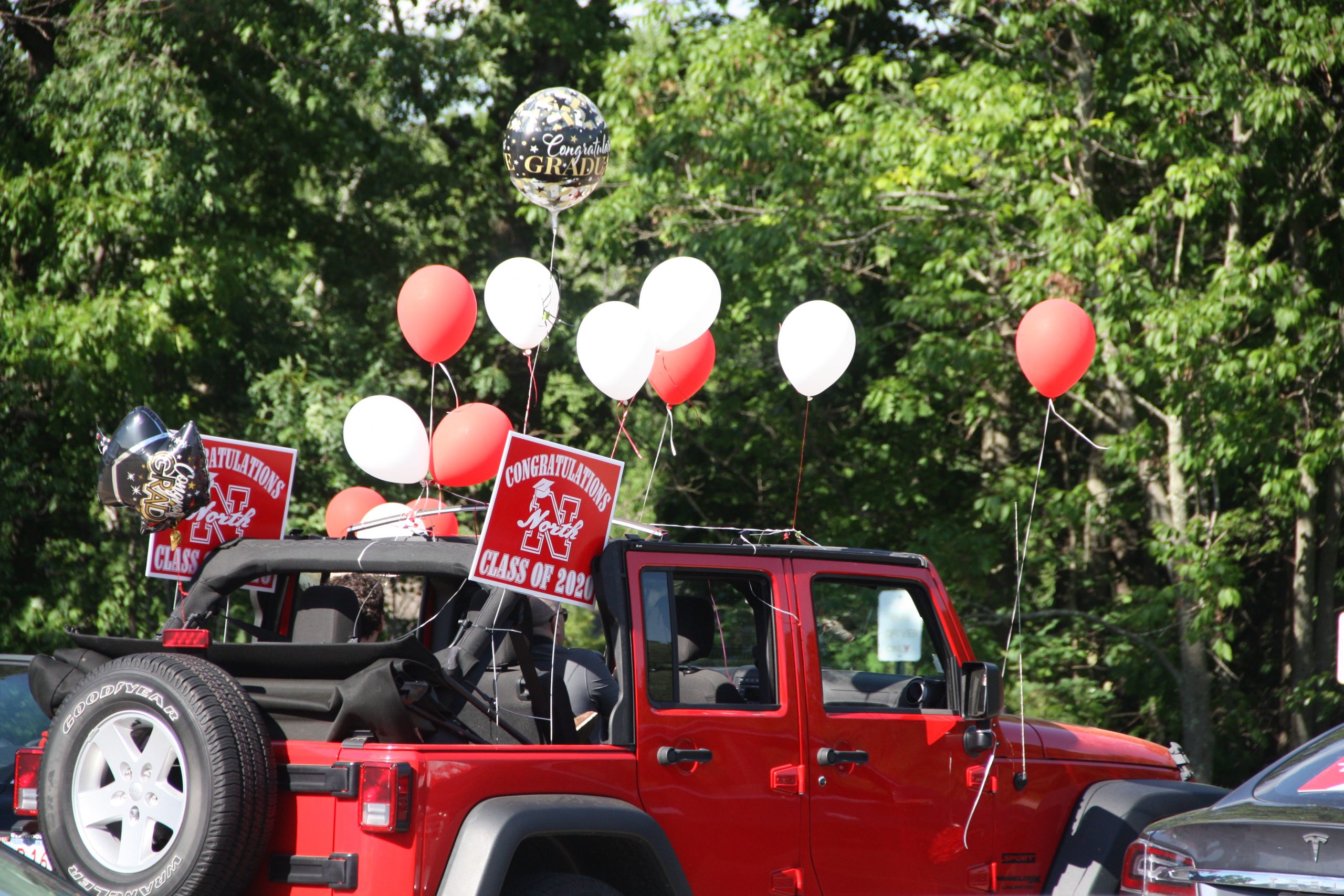 The ceremony was arranged to allow the seniors to officially graduate amidst the COVID-19 pandemic, which has put large gatherings on hold. Seniors arrived at the high school in their parents’ vehicles, arranged in groups and called to a stage set up outside the front door of NAHS. Everyone wore face masks and practiced social distancing throughout the event. After receiving their diplomas, the seniors had their photos taken next to a large “2020.” Many of the vehicles were decorated with red balloons or posters marking the occasion and family leaned out of windows or stood through sunroofs to get photos of the graduates.