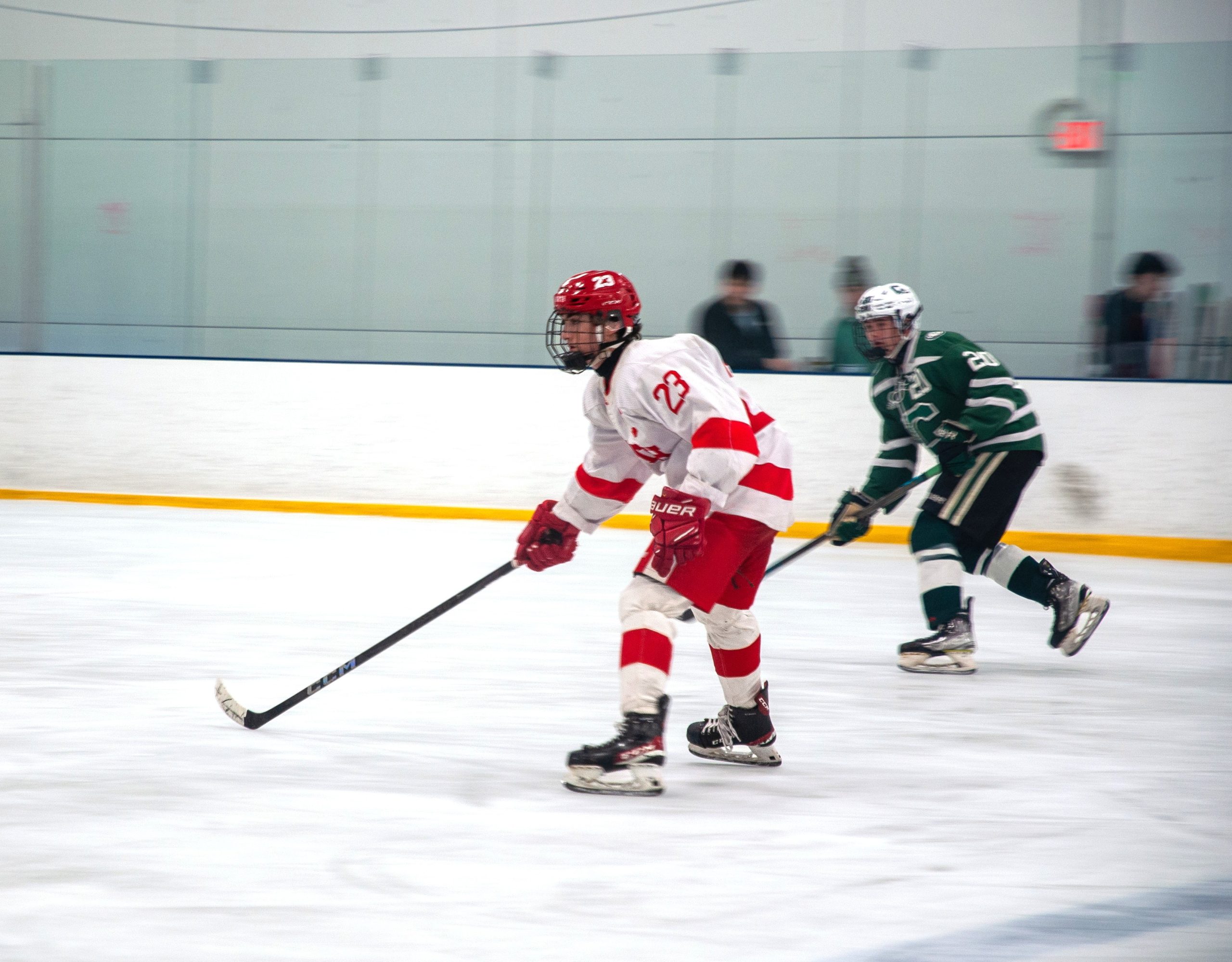Forward Jake Santucci (Number 23) races Canton’s forward to the puck during the Feb. 12 game. PHOTO BY AMBER ANGOVE