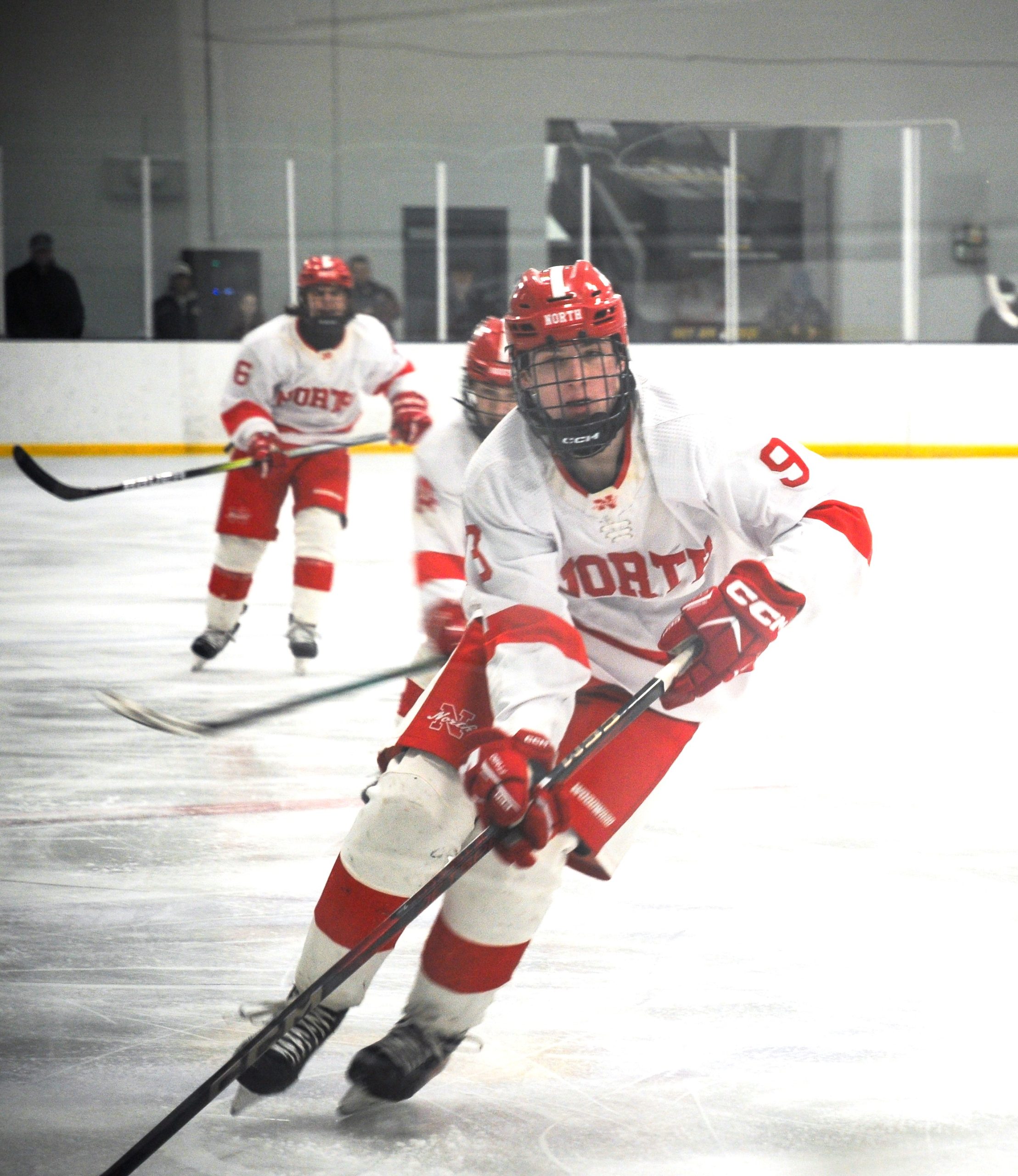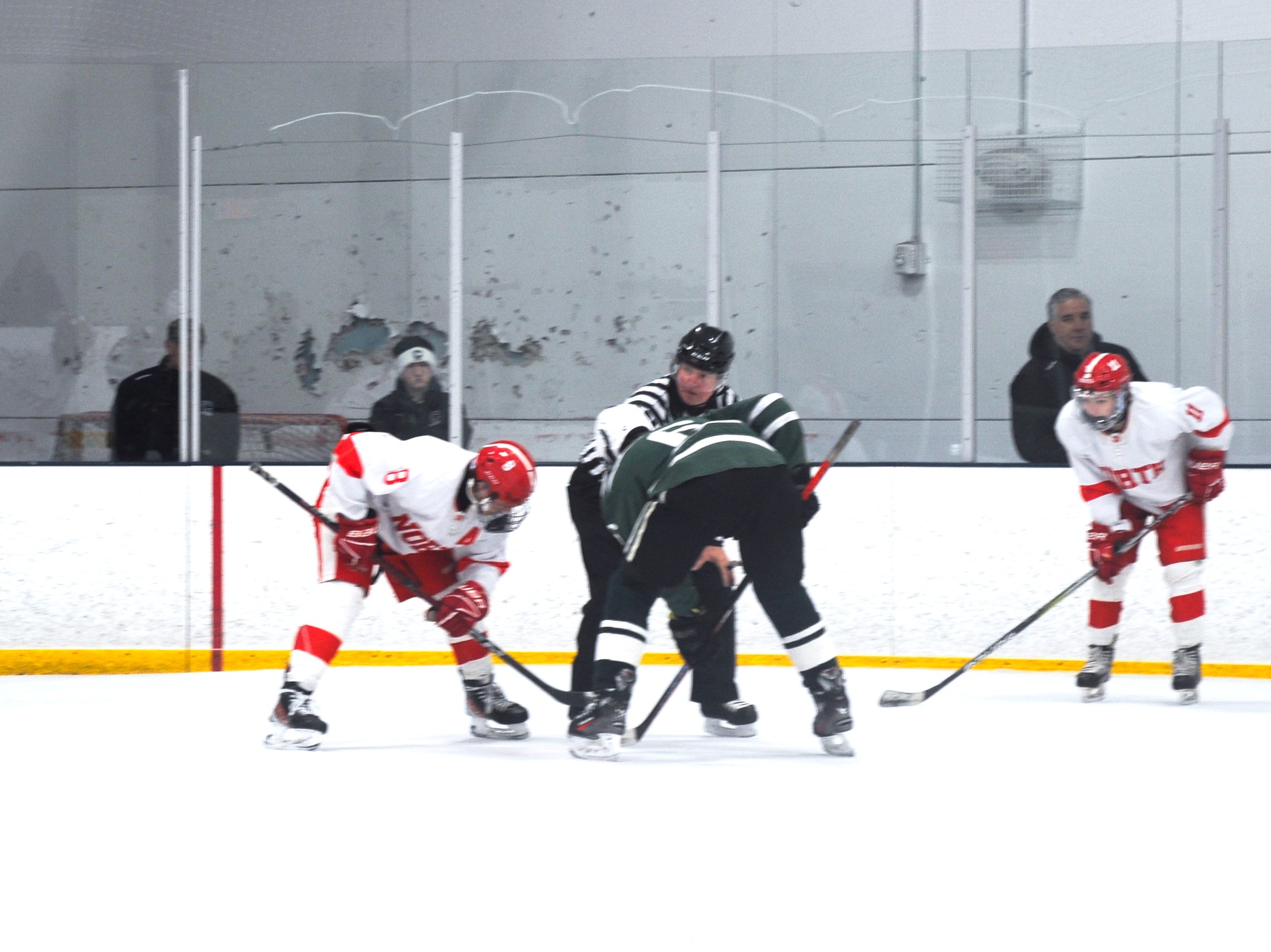 The North Attleborough Red Rocketeers varsity hockey team face off against the Canton Bulldogs in the third to last game of the season. PHOTO BY AMBER ANGOVE