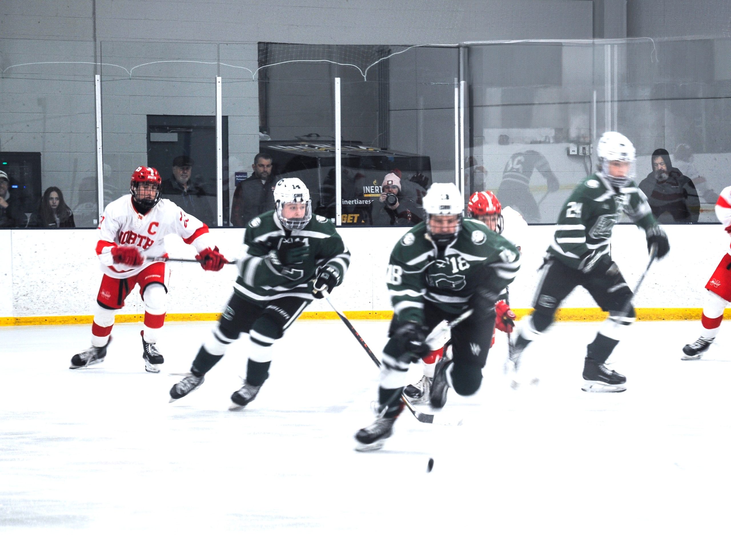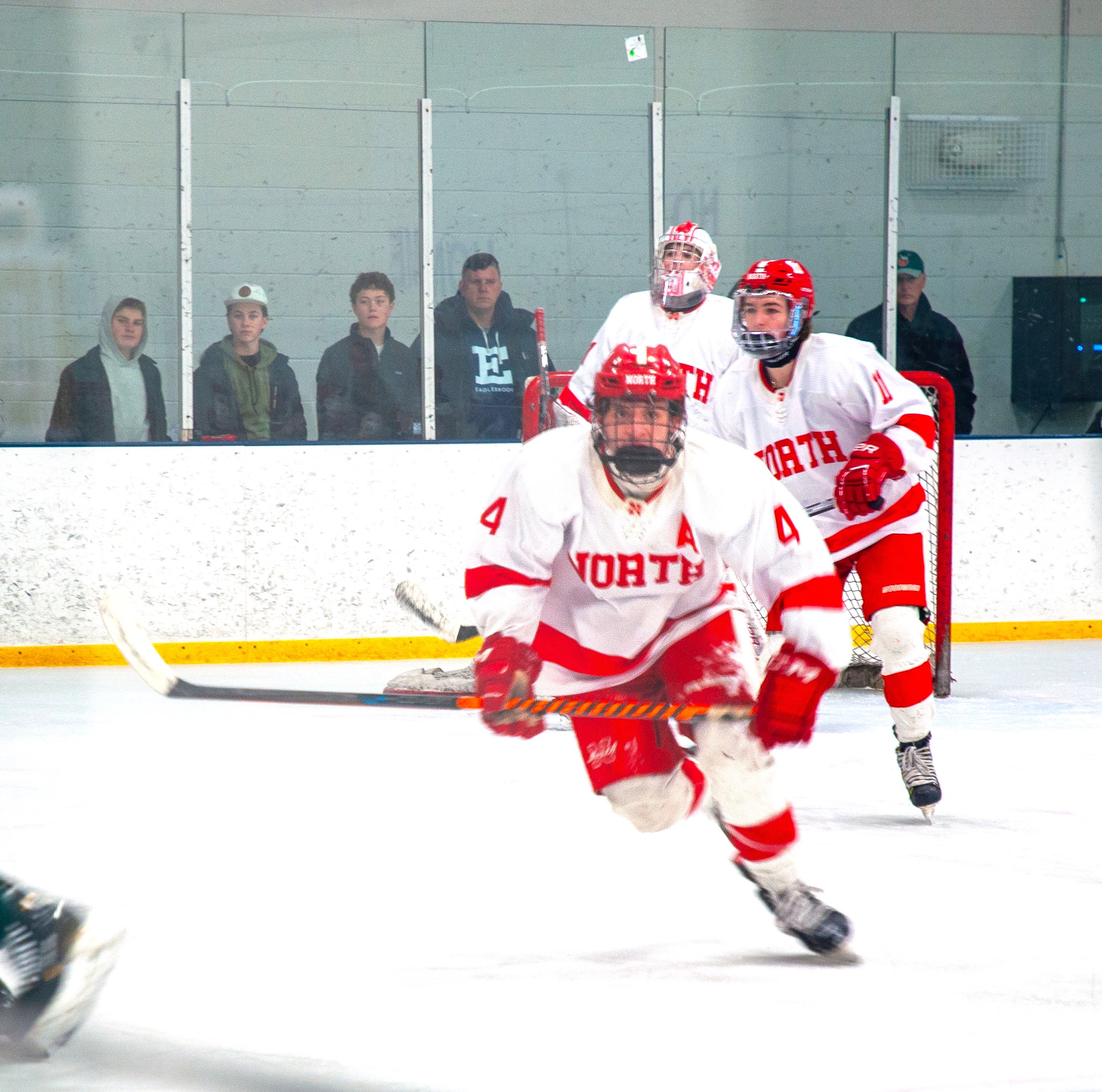 Forward Dominic Bertino (Number 4) and the Red Rocketeers race to the puck in the Feb. 12 game against the Bulldogs. Canton would go on to win, 4-1. PHOTO BY AMBER ANGOVE