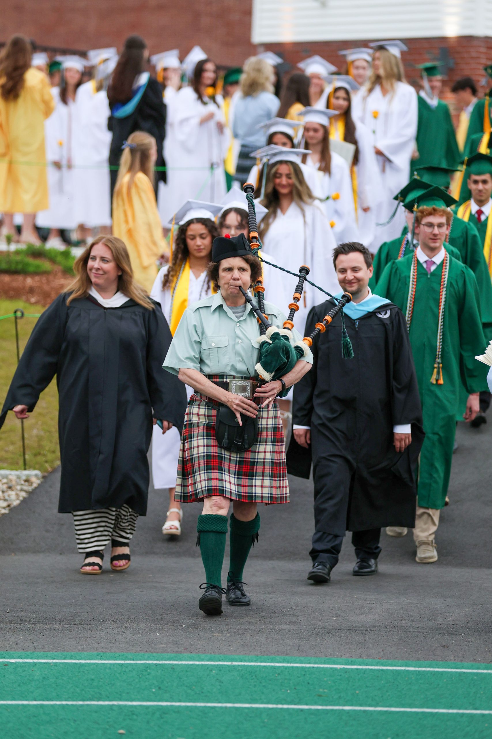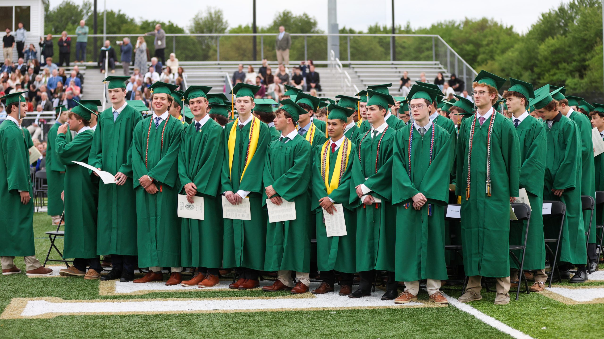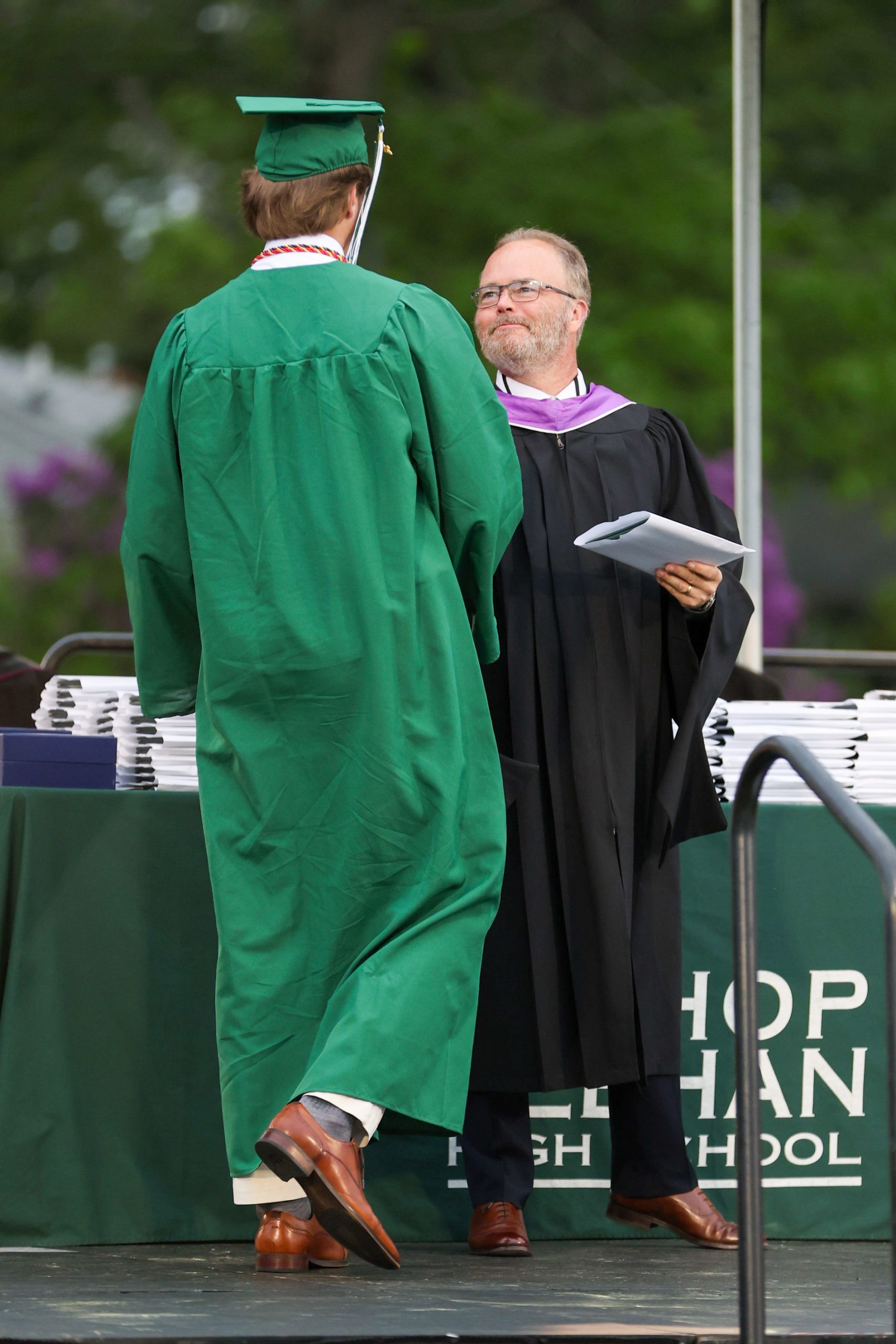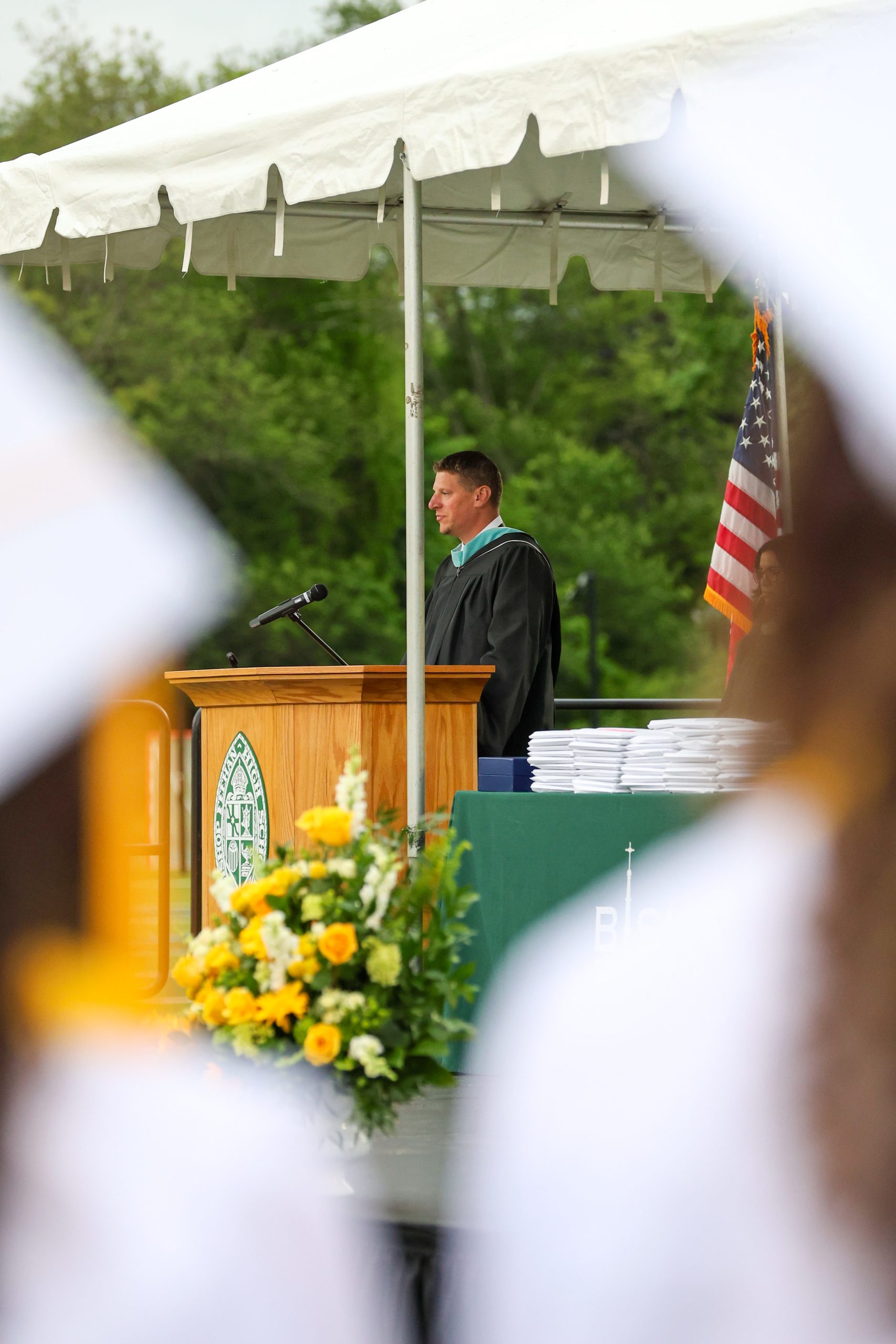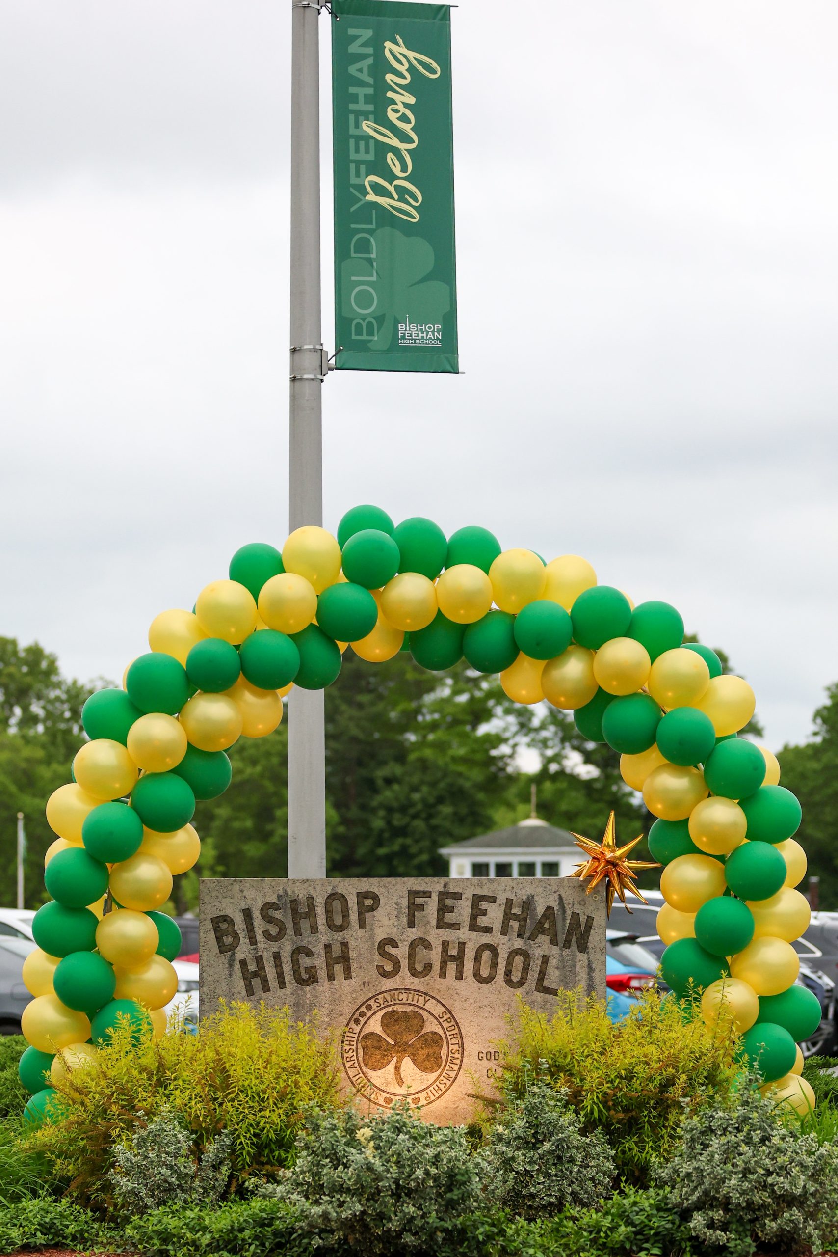 Donned in green and white gowns and caps, 254 graduates made their way down to McGrath Field for the high school’s 61st graduation ceremony, welcomed in by the sounds of bagpipes playing. The Rev. Craig Pregana started the ceremony off with a prayer, followed by greetings from Bishop Feehan President Timothy Sullivan.
