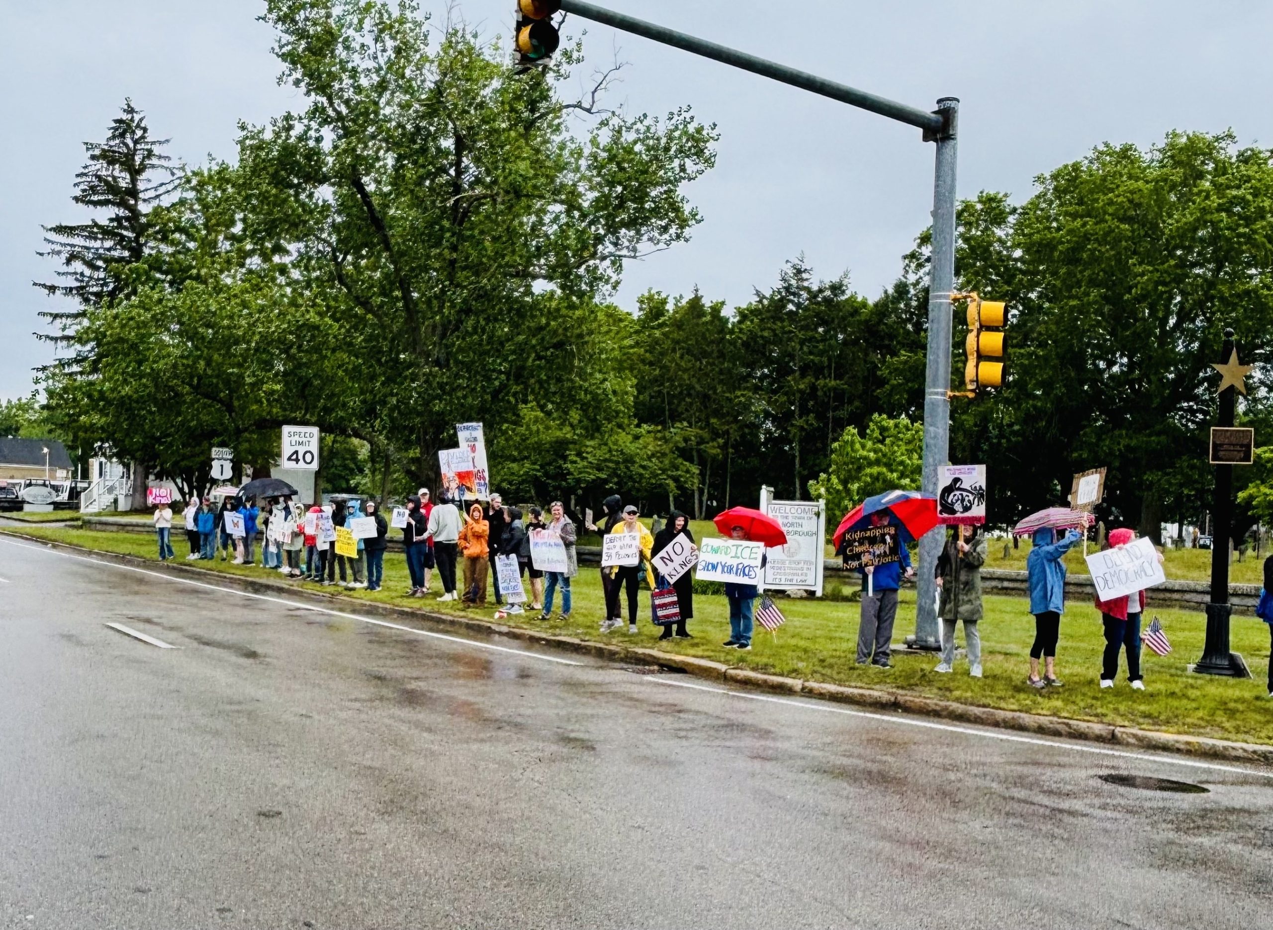 Mike Banks and Kathy Murphy stood under umbrellas along Route One while “For What It’s Worth (Stop, Hey What’s That Sound)” by Buffalo Springfield played in the background as they held signs that read “Kidnapping children is not patriotic” and “No facism.”