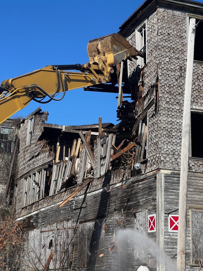 A demolition crew takes down a portion of the Webster Mill building on Monday, March 4. The work was done in response to the risk of the building collapsing. Photo by Leslie Deschenes
