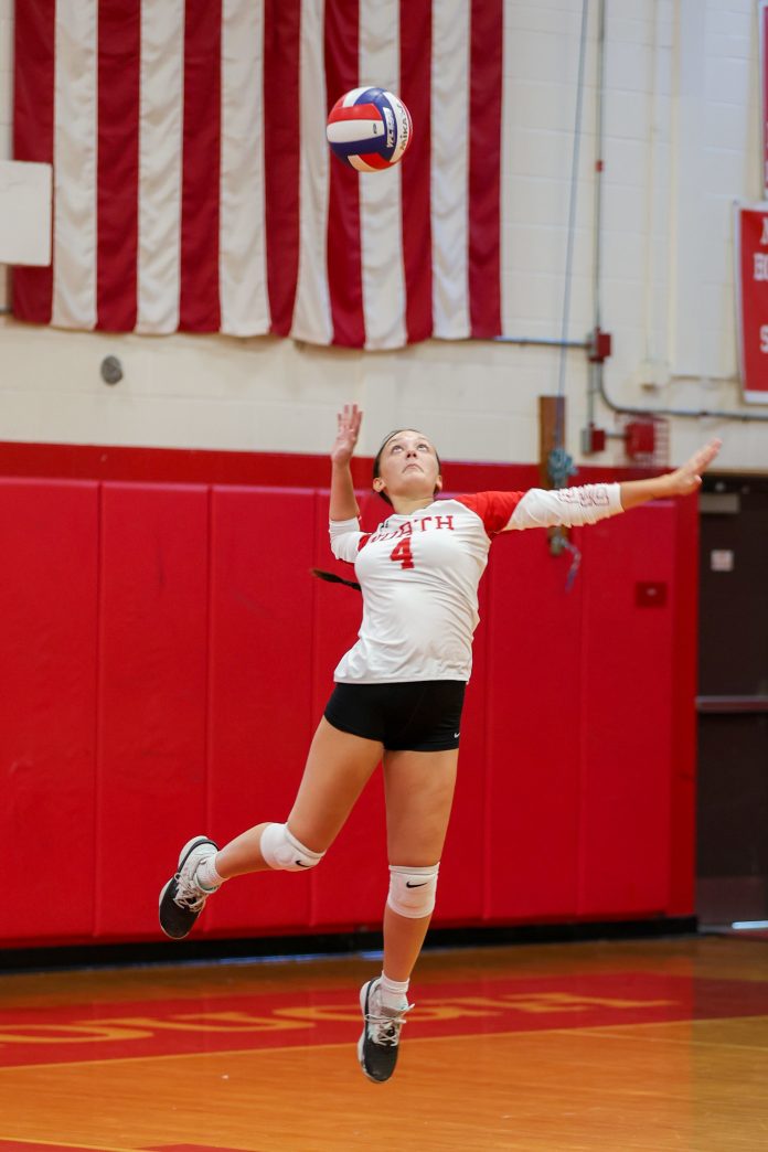 Jordan Egan, #1, vollies across the net to score against Stoughton on Thursday afternoon. PHOTO by LINDSEY FLIGER