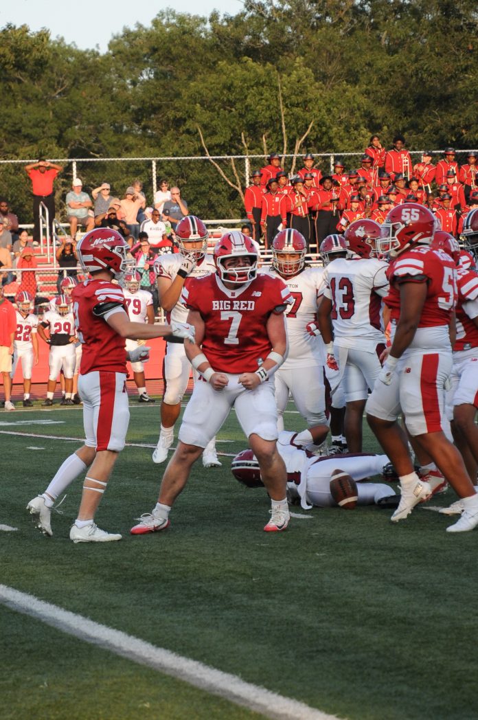 Frankie Strachan (Number 7) hypes up the crowd after advancing on the Brockton Boxers during the season kickoff game on Friday, Sept. 5. PHOTO BY AMBER ANGOVE