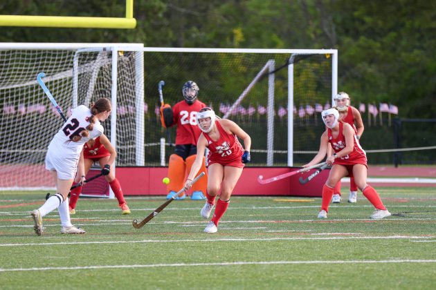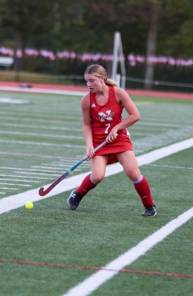 Riley Charron (Number 20) tries to block Taunton from making a goal during the Sept. 9 game. PHOTO BY LINDSEY FLIGER