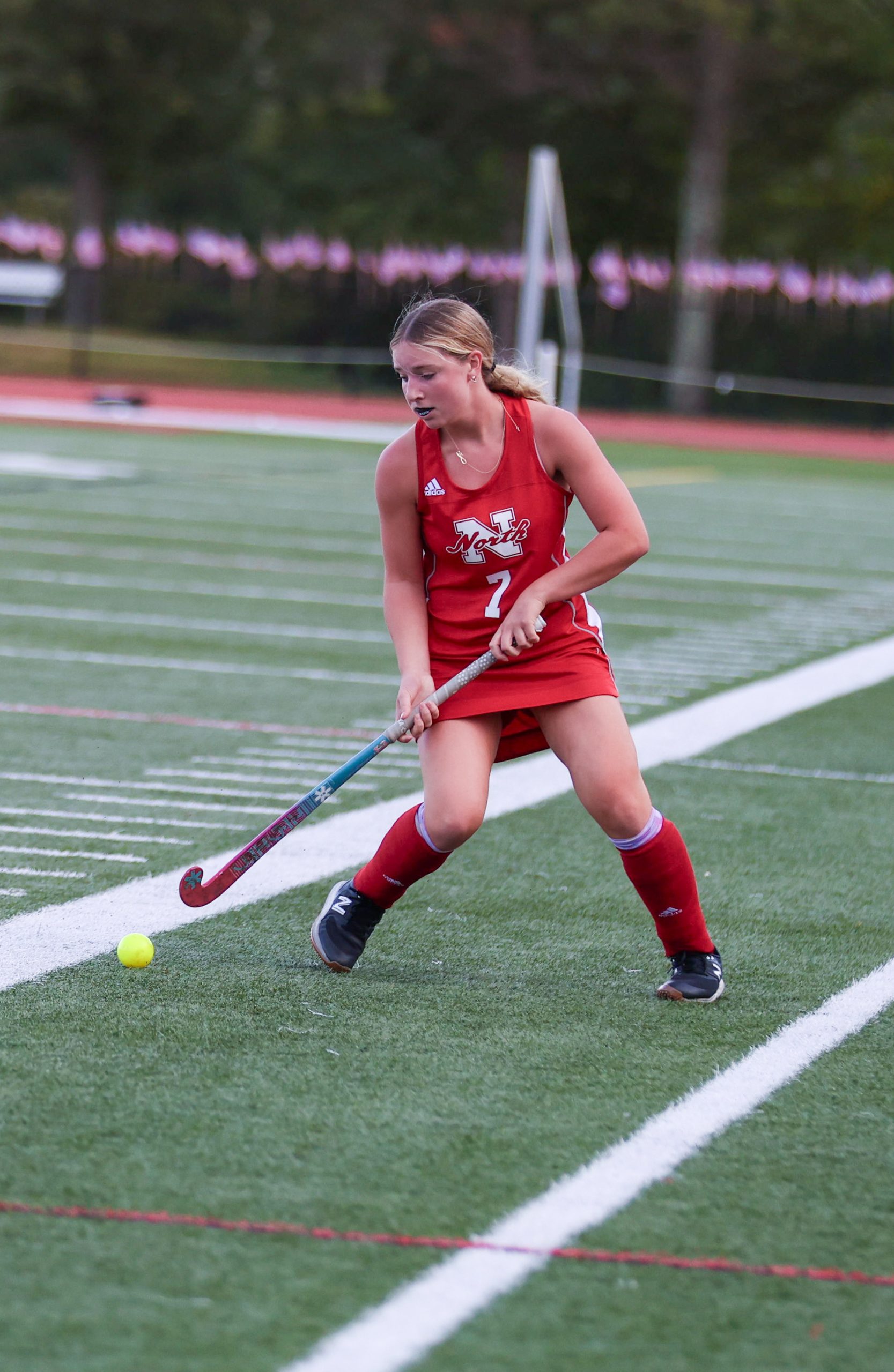 Greta Gouck (Number 7) runs toward Taunton's goal to help North win at home. PHOTO BY LINDSEY FLIGER