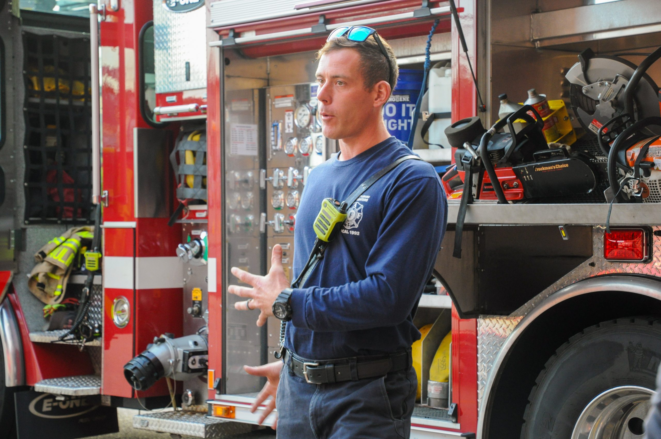Lt. Josh Cretian explains to families how the fire station operates at the North Attleborough Fire Department open house on Oct.18. PHOTO BY AMBER ANGOVE