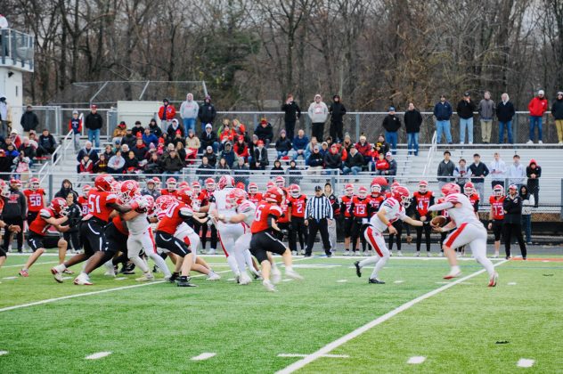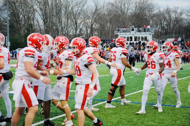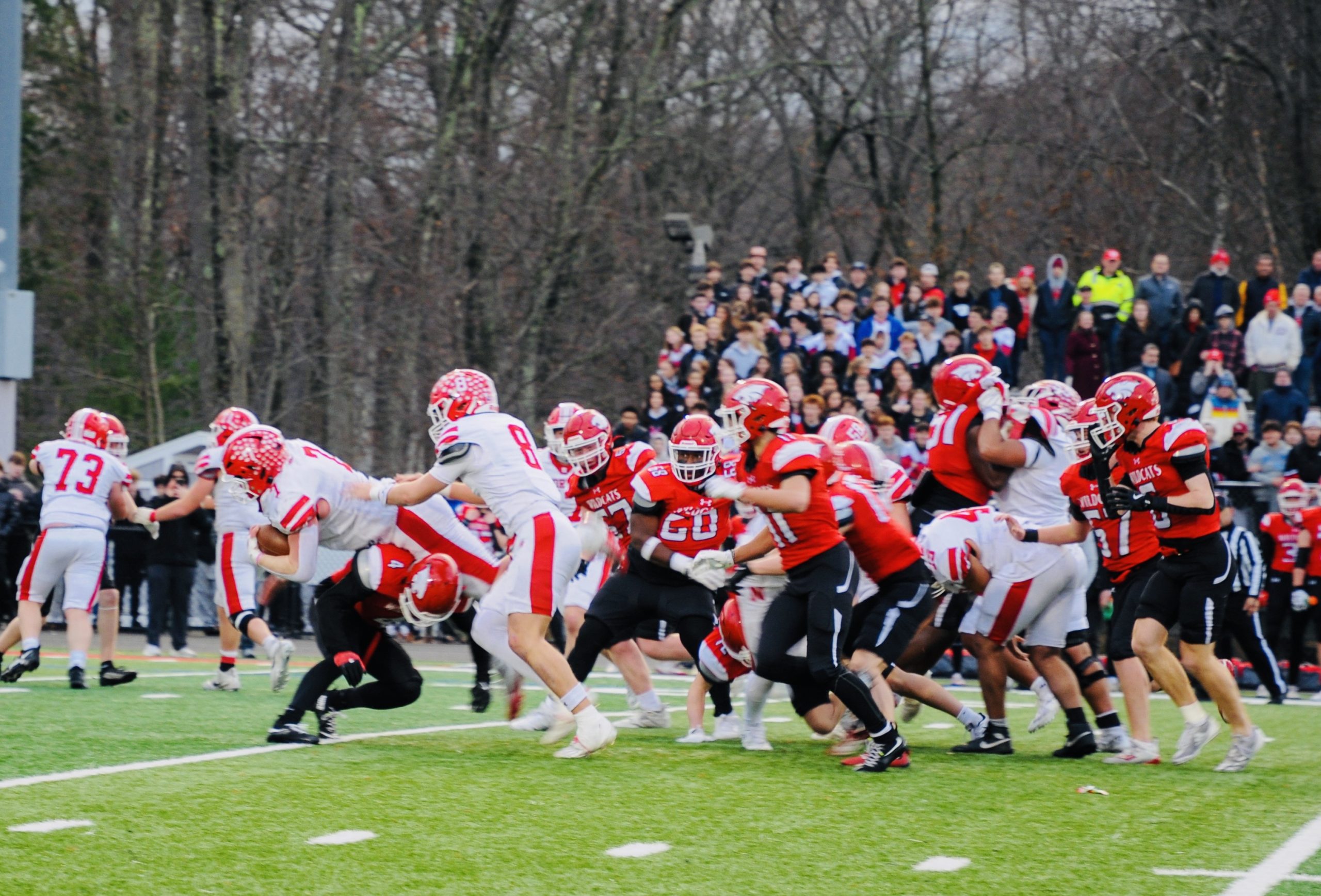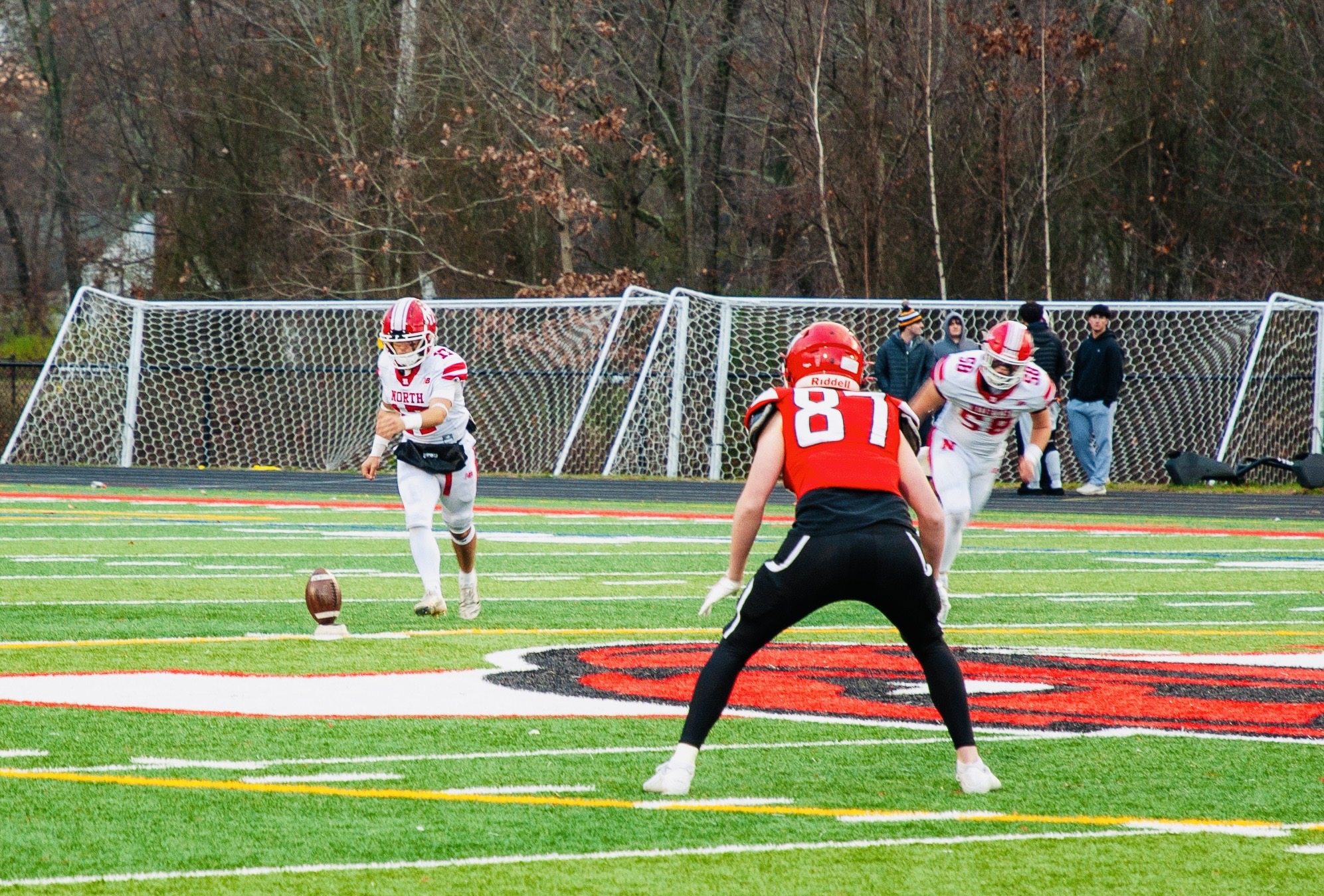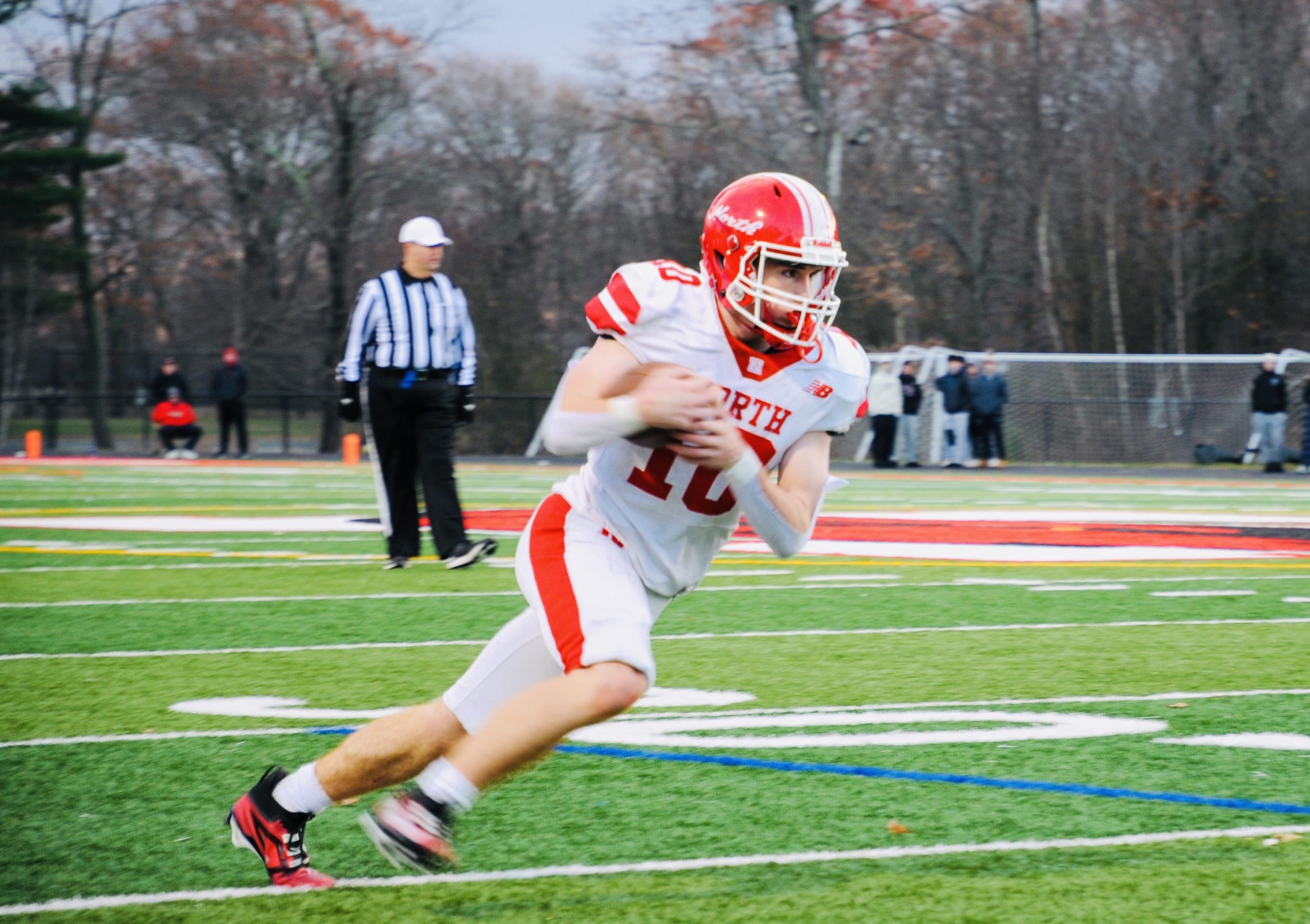 Nathaniel Robin [Number 10] scores a touchdown during the Nov. 22 MIAA Final Four game against Milton. North won, 43-29, and will go on to play King Phillip Regional at Gillette stadium. PHOTO BY AMBER ANGOVE