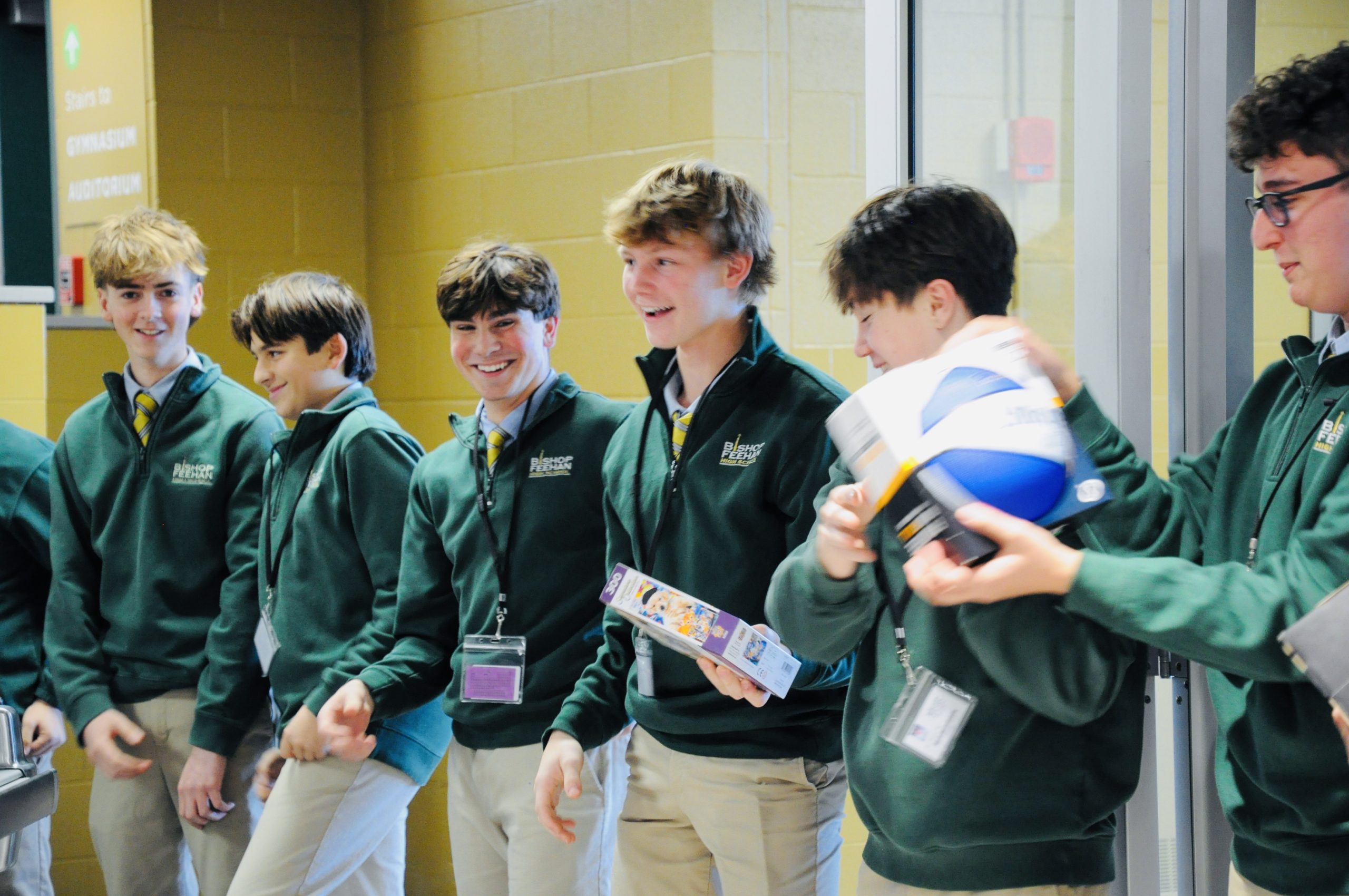 Bishop Feehan students line up inside, passing donated toys to the cafeteria to be sorted for the Santa Shop. PHOTO BY AMBER ANGOVE