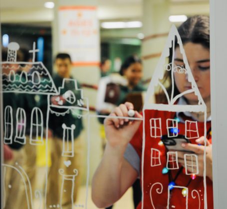 Callie Boucher draws a festive scene on the cafeteria windows for the 2025 Santa Shop at Bishop Feehan High School on Friday, Dec. 12. PHOTO BY AMBER ANGOVE
