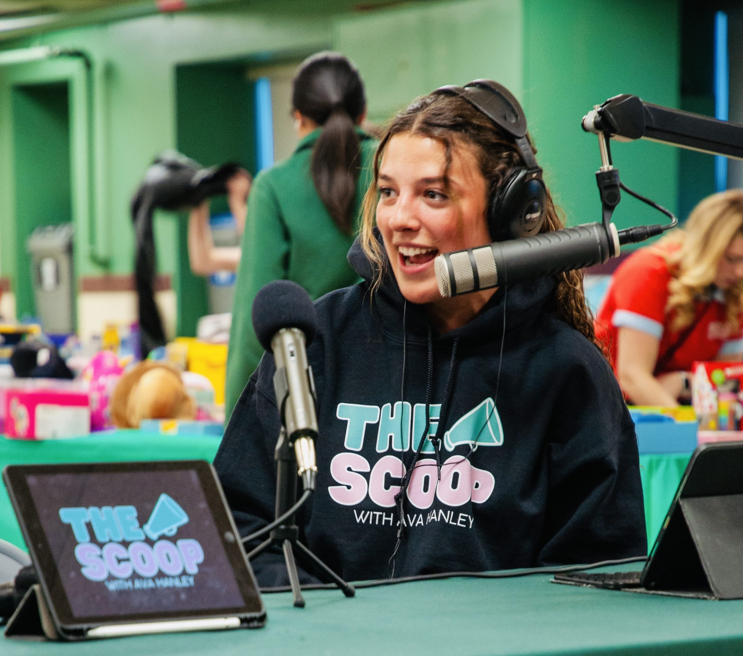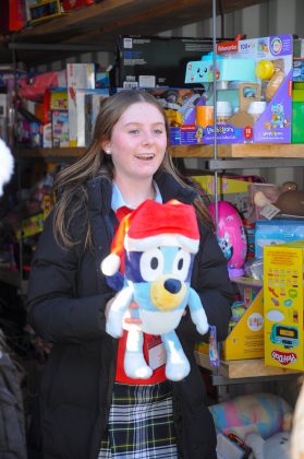Ava Hanley hosts “The Scoop,” the student-run news outlet, as students organize donated toys in the Santa Shop, held in the Bishop Feehan cafeteria. PHOTO BY AMBER ANGOVE