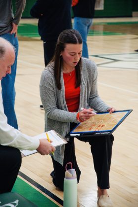 Coach Julia Feid plans second-half plays during halftime against Mansfield High