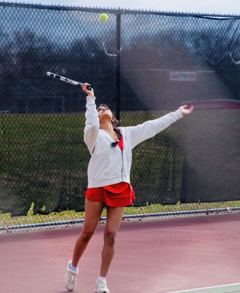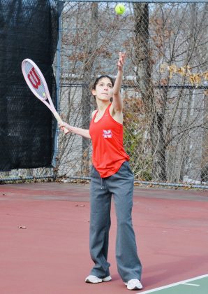 Caroline Gill prepares to serve during her doubles match against Milford High School on March 27. PHOTO BY AMBER ANGOVE
