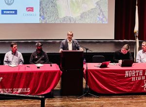 Superintendent John Antonucci addresses the crowd at the April 28 community forum for the new high school. PHOTO BY GEENA MONAHAN